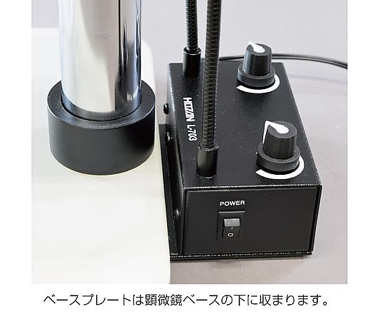 ●目視から顕微鏡まで様々な検視に使用できる自立型フレキシブルアームのスポット照明●400mmの自由に動くフレキシブルアームで、様々な角度からの照射が可能。●明るさは左右それぞれで調節可能のため、細かなライティング調整ができます。●本体が自立型のため、丸棒の支柱を持たない顕微鏡にも使用可能。●L-424/L-523等丸棒の支柱に取付ける場合は、ベースプレートを取り外し、別売のクランプセット(L-703-1)を取付けて使用してください。●付属品:ACアダプター●※L-703-1は別売部品です。●■リスクグループ:リスクグループ1 ※LEDをはじめとした照明器具が影響を及ぼす、生物学的傷害の度合いを示す分類。(JIS C 7550 / IEC62471)●LED:白色PowerLED 1個×2●外形寸法:【本体】90(W)×37(H)×100(D)mm(ベースプレート取り付け時)/90(W)×35(H)×58(D)mm(ベースプレート取り外し時)【アーム長】400mm●寿命:LED寿命:約10000時間 ※使用環境により異なります。●重量:425g●消費電力:6.2W●色温度:6500K●電圧:定格電圧:DC12V(ACアダプター付属)