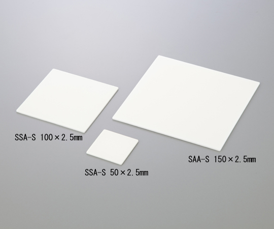 ●化学組成:Al2O3/99.6%、SiO2/0.1%●密度:3.9g/cm3●曲げ強さ:380MPa●耐熱温度:1800℃●サイズ:150×150×2.5mm●型番:SSA-S 150×2.5mm
