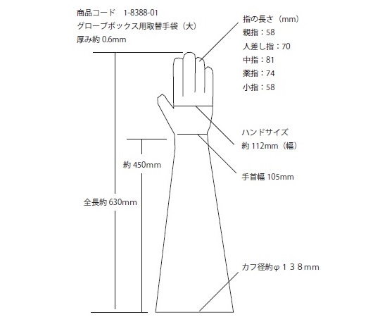 ●掌部が大きいタイプです。●取替用手袋 大●全長(mm):630●材質:天然ゴム●カフ部内径:φ130mm●厚み:0.6mm●パウダー付き●入数:1双
