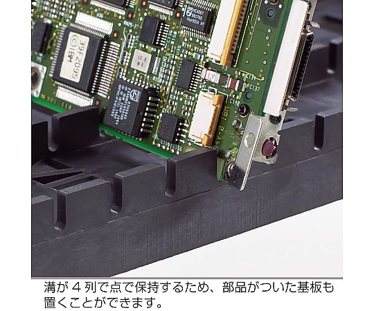 ●小さな基板や部品の付いた基板でも置くことが可能です。●ESD管理値:Rp≦1×10^10Ω●ピッチ:14mm●外形寸法:465(W)×23(H)×140(D)mm●溝深さ:7mm●溝数:25●材質:ポリプロピレン●重量:280g●耐熱温度:85℃●入数:10●幅:溝幅:3.2mm