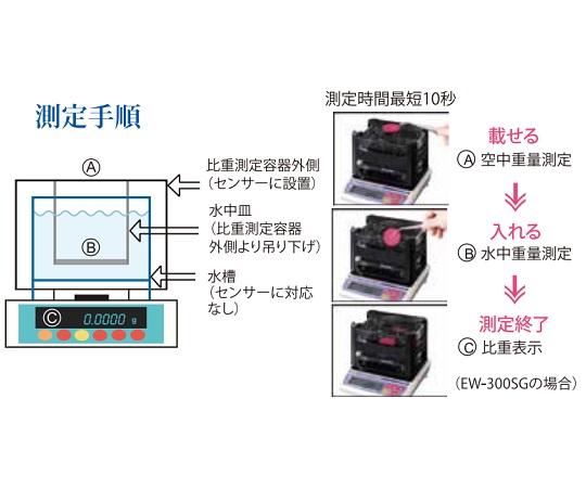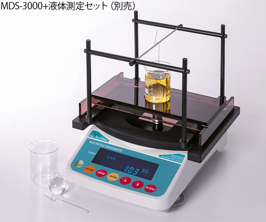 ●最大3kgまで測定可能、いままで困難であった重い物が簡単に測定できます。●比重と重量は最小表示0.01、さらに補助表示で0.001まで測定できます。●比重測定容器フタは折りたたみ式になっており、測定物の大きさに合わせた使い方ができます。●測定値は更新できるので、吸水性のある物等の比重や体積の変化率を求めることができます。●大きく特殊な形状の測定物用の特殊容器を作成できます●秤量(g):0.02~3000●比重最小表示(g/cm3):0.01●水中置換(懸架)方法:水中置換(懸架)方法●測定種類:固体比重・液体比重・紛体比重測定●インターフェース:RS-232C●サイズ:240×260×240mm●重量:4.2kg●電源:AC100~240V 50/60Hz●付属品:ピンセット、水温計、ステンレスアングル、RS-232CインターフェースACアダプター●※液体比重の測定には別売の液体測定セットが必要です。