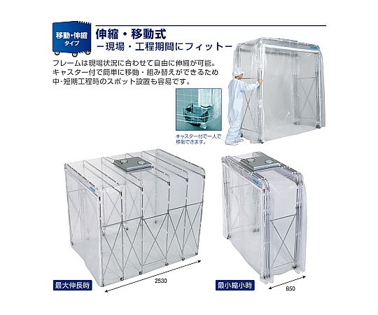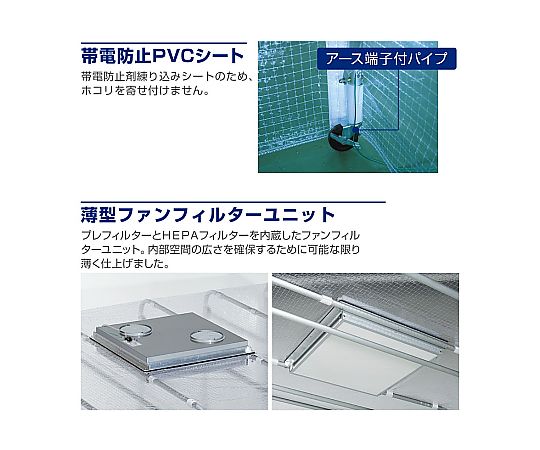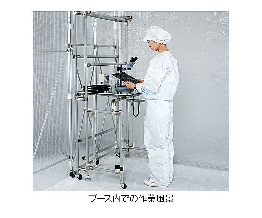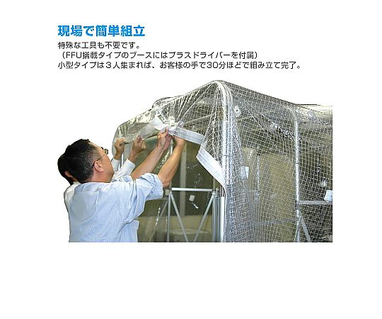 ●思いのままに移動・展開できる伸縮自在な組立式簡易クリーンブース●帯電防止剤練り込みシートを採用し、ホコリを寄せ付けません。●CL-901はファンフィルターユニット・ブースが含まれております。●■CL-901にはファンフィルターユニット・ブースが含まれております。●■清浄度クラス:クラス6~クラス7( ISO14644-1/JIS B 9920-1)、1000~10000(米国連邦規格209E)●外形寸法:2000×850~2530×2200mm●厚さ:0.3mm(シート)●材質:【シート】強化繊維入り防炎タイプPVCシート(帯電防止剤練り込み)、【フレーム】アルミ合金●重量:51kg(シート12kg+フレーム25.5kg+FFU13.5kg)●消費電力:64/60W(50/60Hz)●入数:1●容積:ブース容積:3.74~11m^3●※運送費・搬入費・据付費・組立費等が別途必要です。お問い合わせください。