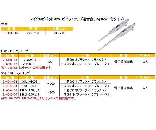 ●ステップ状に分注容量を調節しますので正確な設定ができます。●本体全体のオートクレーブ滅菌が可能です(121℃、20分)。●チップインジェクター位置を調節できるので、幅広いチップの使用が可能です。●ユーザーによるキャリブレーションも可能です。●容量調整は分注ボタンを回すだけで容易に変更できます。●オートクレーブ可(分解不要・121℃・20分)●分注容量:20~200uL●最小可変容量(uL):0.2●精度(最小容量時):<±1.5%●精度(最大容量時):<±0.6%●再現性(最小容量時):<0.6%●再現性(最大容量時):<0.2%●型番:825.0200