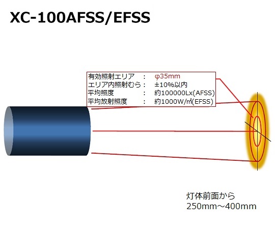 ●晴天時の正午±2時間に地表に到達する太陽光と同じスペクトルの光を出す照明器具です。●太陽光のもとで見るのと同じ色彩を室内に。●★スーパースポット(集光)タイプで、真夏の太陽光と同等の照度10万Lxの光を照射可能です。●★照射距離300mmで約Φ25mmの範囲を約10万Lxの光で照射できます。●★フロスト(白っぽいすりガラス)フィルタのため、均一性の高い光を照射。●★経時変化がほとんど無い。「平均演色評価数は高くても、使用しているうちに光の特性が変わっている」そのような光源をご使用していませんか。●★可視光(370~780nm)を自然太陽光に高近似させました。●★お客様が「雨や曇りの日」でも「昼夜を問わず」作業ができるよう、「24時間365日晴れ」を提供します。●★型番:XC-100AFSS(光源部。電源コード付き)●仕様:色彩評価用フロストスーパースポット照明タイプ●★使用フィルタ:フロスト(AFフィルタ)●電源:AC100V(AC90~132V) 50/60Hz 1.8A●ランプ容量:100W●点灯方向:下~横向き(上向き使用不可)●中心光度・ビーム角:1600cd・約60°●平均演色評価数:98●放射波長域:370~780nm(紫外線カット・熱線約80%カット)●色温度:約5500K●サイズ/重量:φ132×287mm/約2.5kg●★使用ランプ:キセノンランプ(型式:SET-140F)●★ランプ交換推奨時間:約2000時間●●★【XC-100AFSSの主な使用例】●★ディスプレイの視認性評価●★タッチパネル、スマートフォン、計器類の視認性評価●★カメラの逆光状態での視認性、画質評価●★カメラの視野内の輝度ムラ(日向と日陰の混在)発生時の画質評価●★製品の反射特性試験●★※その他の使用例も、「主な使用例の紹介資料」をダウンロードしてご覧いただけます。●購入をご検討中の御客様にはデモ機のお貸し出しが可能です。お問い合わせください。●無償デモ機の期間は1週間です。