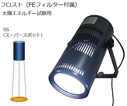 ●晴天時の正午±2時間に地表に到達する太陽光と同じスペクトルの光を出す照明器具です。●★スーパースポット(集光)タイプで、真夏の太陽光と同等のエネルギー1kW/㎡の光を照射可能です。●★照射距離300mmで約Φ30mmの範囲を約1kW/㎡の光で照射できます。(配光の調整はご相談下さい)●★フロスト(白っぽいすりガラス)フィルタのため、均一性の高い光を照射。●★紫外光~赤外光(350~2500nm)を自然太陽光に高近似させました。●★自然太陽光に非常に近似した分光分布の光なので、より自然環境に近い条件で試験が行えます。●★経時変化がほとんど無い。「平均演色評価数は高くても、使用しているうちに光の特性が変わっている」そのような光源をご使用していませんか。●★お客様が「雨や曇りの日」でも「昼夜を問わず」作業ができるよう、「24時間365日晴れ」を提供します。●★型番:XC-100EFSS(光源部。電源コード付き)●仕様:太陽エネルギー試験用フロストスーパースポット照明タイプ●★使用フィルタ:フロスト(EFフィルタ)●電源:AC100V(AC90~132V) 50/60Hz 1.8A●ランプ容量:100W●点灯方向:下~横向き(上向き使用不可)●中心光度・ビーム角:1600cd・約60°●平均演色評価数:96●放射波長域:350~2500nm●色温度:約5500K●サイズ/重量:φ132×287mm/約2.5kg●★使用ランプ:キセノンランプ(型式:SET-140F)●★ランプ交換推奨時間:約2000時間●●★【主な使用例】●★温度上昇試験●★遮熱性試験●★耐熱性試験●★耐光性試験●★太陽電池の簡易評価●★光触媒実験●★太陽光下における化学反応再現実験●★※近赤外波長(850nm、905nm、940nm等)に感度のある赤外カメラ、赤外線センサの評価をご検討のお客様は、特注品にて製品を提供しています。別途お問い合わせ下さい。●★※その他の使用例も、「主な使用例の紹介資料」をダウンロードしてご覧いただけます。●購入をご検討中の御客様にはデモ機のお貸し出しが可能です。お問い合わせください。●無償デモ機の期間は1週間です。