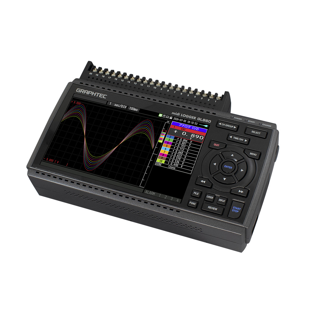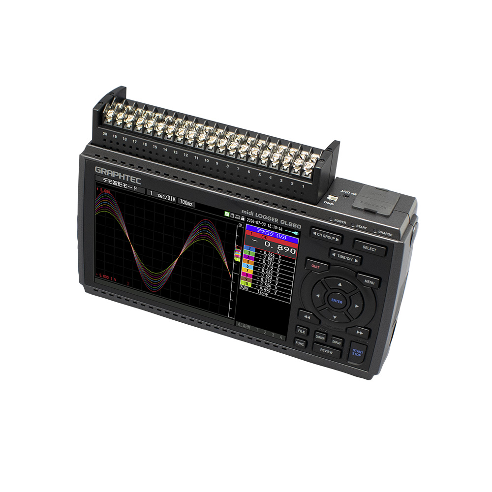 ●GL840-M、GL840-SDMの後継商品です。本体メモリは取り出し不可となります。●電圧・温度・湿度(湿度は1チャネルのみ)を計20チャネルのデータ取得ができます。●イーサネット、USBインターフェース付きでパソコンに接続が可能です。●オプションで無線LANユニット(B-568)を装着できます。(オプションのSD メモリカードと同時装着不可能)●測温抵抗体の接続は不可です。●サイズ(mm):約240×158×52.5●重量(g):約1010●測定範囲:電圧/20・50・100・200・500mV・1・2・5・10・20・50V、100V、1-5V/F.S.、温度/熱電対K、T他、湿度/0~100%(オプション:B-530必要)●入力チャンネル:20ch・M3ねじ式端子、ロジック入力4chまたはパルス入力4ch ※GL用入出力ケーブル(B-513)が必要です。●サンプリング周期:5ms~1h(5~50msは電圧のみ、サンプリング周期によりch制限あり)●全CH絶縁入力●内蔵メモリ:SD1約8GB(内蔵固定化)※収録ファイルは1ファイル2GBまで●表示内容:アナログ波形・測定中の過去データ表示・デジタル値●対応OS:Windows11/10●電源:AC100~240V 50/60Hz(ACアダプタ付属)またはDC入力 DC8.5~24V(オプション:B-514必要)●※バッテリーパック(B-573)はオプションです。