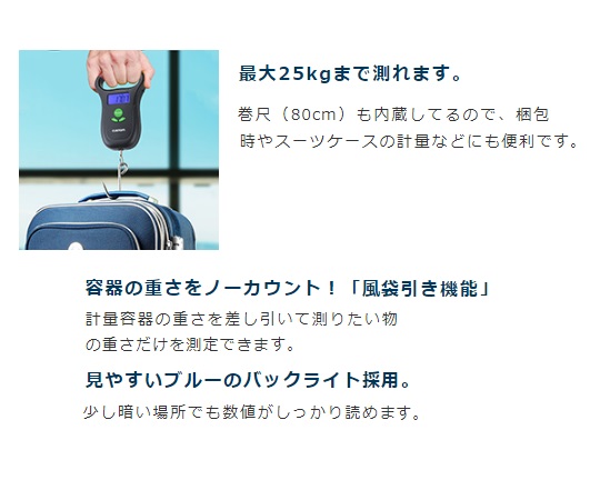 ●秤量(kg):25●最小表示(kg):0.05●巻尺:800mm●データホールド機能付き●オートパワーオフ機能付き●バックライト付き●電源:単4乾電池×2個(テスト用付属)●サイズ:90×30×147mm ●重量:約166g ●防水:IPX4