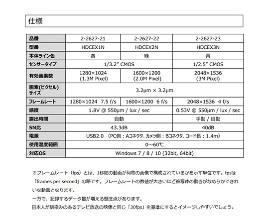 ●パソコンのUSBポートにつなぐだけで映像が観察できます。●ライブ画面による映像の観察・静止画の保存、2点間距離計測機能付きです。●画素数:300万画素●撮像素子:1/2.5インチCMOSセンサー●マウント:Cマウントφ23.2mm・φ30.0mm●対応OS:Windows?7/8/10/11●インターフェース:USB2.0●本体サイズ:φ60×80mm●付属品:φ30mm変換アダプター、USBケーブル(コード長:140cm)、CD-ROM(ソフトウェア)