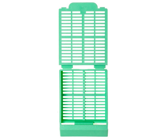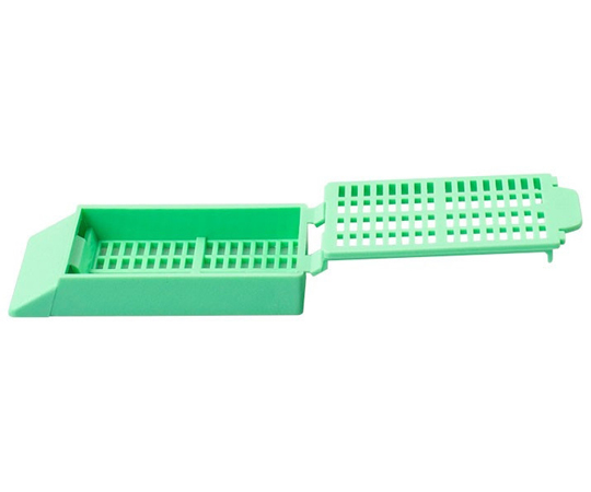 ●生検材料を固定液に浸す際に使う網目状の容器です。●ベースとカバーは一体成形されており、カバーを折ってカチッと音が鳴るまでベースにはめ込み使用します。●書き込みエリアのスロープは約45°です。●材質:アセタールポリマー●薬液入出孔サイズ:約0.9×2.7mm(角穴)●外寸法:40×28×6mm●内寸法:29×26×4mm●入数:1箱(500個/小箱×3)●型番:M498-4●色:緑●スロープ角度:45°●※脱水・脱脂の洗浄用のカセットです。※ミクロトームフォルダーで強くしめすぎるとたわむ事があります。