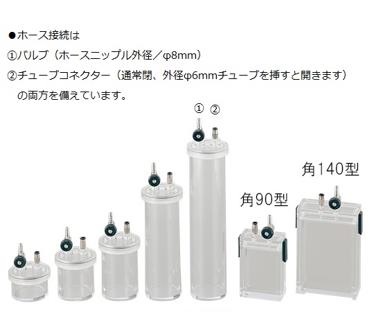 ●小型・リーズナブルなデシケーターです。●小型・軽量で持ち運びに便利な真空デシケーターです。●減圧ガス置換に対応しています。●材質:本体/透明PMMA(アクリル樹脂)、 パッキン/NBR(丸型)●許容真空度:約133Pa●バルブ:ホースニップル外径/φ8mm●チューブコネクター:外径φ6mmチューブ適合・ワンタッチ式(チューブを挿すと開きます)●内寸法(mm):φ60×200●推奨真空ポンプ:(1-4148-11)ドライ真空ポンプDTC-22、( 1-671-06)ドライ真空ポンプDA-20D