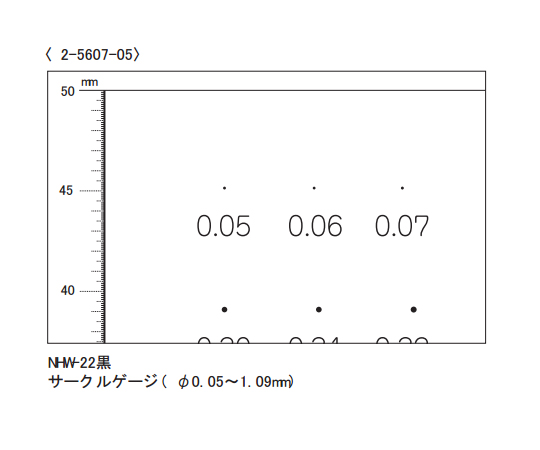 ●黒塗り潰しの円ゲージを各寸法ごとに表記してありますので様々な用途でご使用いただけます。●用途目的別のパターンでマイクロスコープ等の拡大顕微鏡による簡易検査、測定が容易です。●ポリエステル製の為、取り扱いが容易です。●キャリブレーション(校正)シートとして、測定機器の基準スケールや画面表示スケール精度確認、比較・証明用に便利です。●工業関連、学校や病院、研究機関、バイオ技術などの検査、観察用スケールとして多くの業界で利用されています。●タイプ:サークルゲージ●目盛単位(mm):φ0.05~1.09●シートゲージ●材質:ポリエステル●サイズ:75×105mm●図形精度:±0.004mm以内(寸法値は○(塗りつぶし)の線の外径基準)●線幅:0.006~0.008mm●※サークル内を塗りつぶしてあります。●用途:汚れ・異物比較等に。●シート厚み:0.175mm