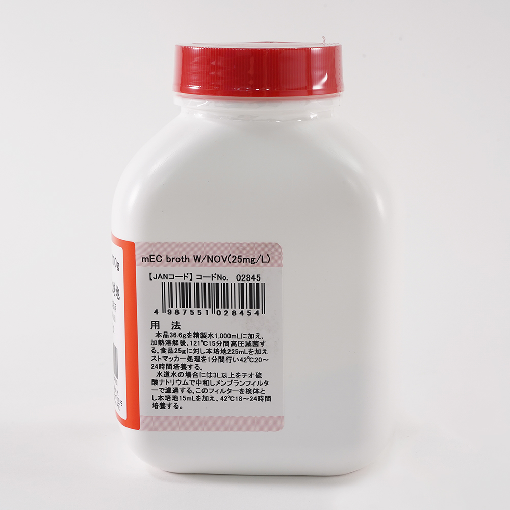 ●ノボビオシン加mEC培地は水・食品からの検出に必須な増菌培養において、大腸菌O157を選択的に増菌することが出来ます。●培地名:プレメディアノボビオシン加mEC培地●適合:大腸菌O157増菌用●容量(g):100●組成:1L=36.6g●mEC培地に予めノボビオシンを25mg/Lに添加したもの●pH6.9±●内容:ペプトン20.0g・胆汁酸塩1.12g・乳糖5.0g・リン酸水素二カリウム4.0g・リン酸二水素カリウム1.5g・塩化ナトリウム5.0g・ノボビオシンナトリウム0.025g●※保存方法:室温