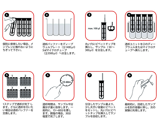 ●微量なサンプルで透析が可能です。●分画分子量(kDa):3.5●サンプル容量(μL):~300●入数:1セット(8連×12本)●XpressMicroDialyzer