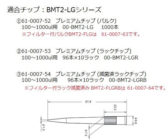 ●同一容量を繰り返し分注する作業に適しております。●チップ取り外しも、片手で簡単操作のチップイジェクター付きです。●手の温度に影響されず、長時間使用に応えるタフ&精密ボディです。●容量設定方式:固定式●容量範囲(uL):500●精度(%):±0.5●再現性(%):<0.2●適合チップ:BMT2-LG●精度:±0.8●再現性:≦0.3●★シングルチャンネル