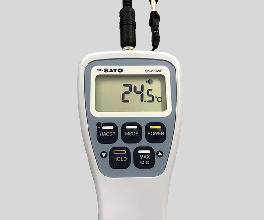 ●HACCP機能が付いており、加熱時間および温度に合わせてLEDやブザーで知らせます。●シリアルNo、校正年月表示機能本体のシリアルNoおよび、機器校正を行った年月を表示します。●センサケース外周の保護ラバーにより、落下による破損など耐衝撃性に優れています。●SK-270WPセット●内容:本体+センサー付き●表示範囲 -40.0~250.0℃ ●本体精度:-40.0~+200.0℃/±(0.1+1digit)、その他/(0.5±1digit)※測定環境が0~40℃の場合●規格:JIS C0920 IPX67に準拠(センサ接続時)●機能:表示固定(HOLD)・オートパワーオフ(60分)・最高最低温度(MAX,MIN)・HACCP(温度/時間)・ブザー(約70dB)・ローバッテリーマーク●使用環境条件:-10~+60℃ 80%rh以下(結露無きこと)●分解能:0.1℃●★表示サンプリング 約0.5~1秒※温度変化の激しいときは約0.5秒、緩やかな変動のときは約1秒へ自動で変更します。 ●センサー:使用温度範囲/-40~+250、サイズ/Φ3×100mm(S270WP-01)●材質:本体/ポリカーボネート表示部・キースイッチ部/PET樹脂●サイズ:70×40×171mm●電源:単4乾電池×2個(テスト用付属)●★電池寿命 約1000時間 、約500時間(ブザー作動時) ●重量:約142g(電池含む)●付属品:標準センサ(S270WP-01)、単4形アルカリ電池 2本、本体ビニールカバー・ネックストラップ●※総合精度は接続するセンサプローブにより異なります。