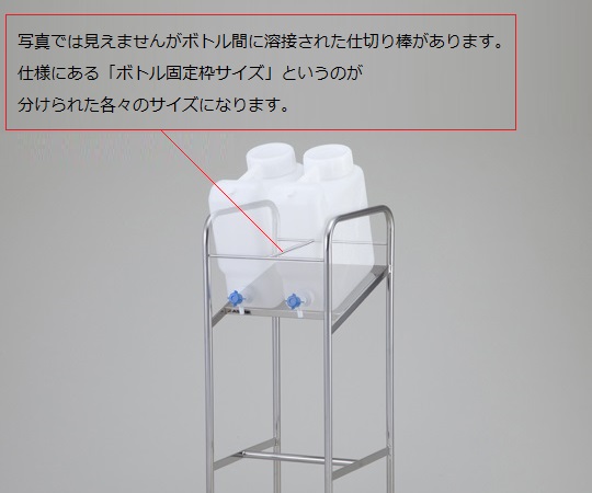 ●台が傾斜していますので、残液が水平置きの1/4以下になります。●ステンレス製ですので耐薬品性・防錆性・耐久性に優れています。●液残りを少なくするスタンドです。●型番:5TKS●サイズ(mm):363×348×920●搭載ボトル:5L×3個●ボトル固定枠サイズ(mm):103×321●材質:ステンレス(SUS304)●キャスター:φ50mm(対角ストッパー付き)●天板高さ:650mm(前面部)●※スクエアーボトルは付属していません。