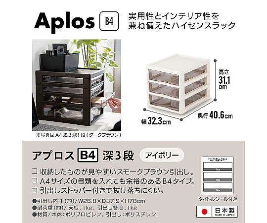 ●B4サイズの引出しで、A4ファイルも収納できます。●材質:PP・PS●引出し内寸法:268×379×78mm●キャスター:φ40mm(ストッパー無し)●サイズ(mm):323×406×311●重量(kg):2.3●引出し数:3●※高さは付属キャスター取り付け時(キャスターを取り付けない場合の高さは、キャスター高さ50mmを引いた高さとなります)。●型番:AP-F3