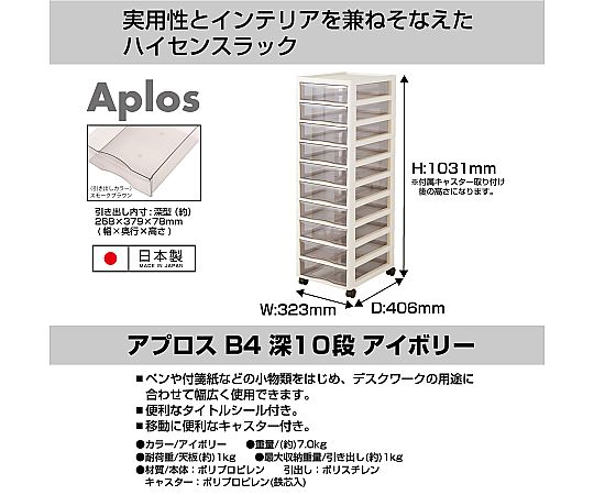 ●B4サイズの引出しで、A4ファイルも収納できます。●キャスター付きです。●材質:本体/PP・PS、キャスター/PP(鉄芯入)●引出し内寸法:268×379×78mm●キャスター:φ40mm(ストッパー無し)●サイズ(mm):323×406×1031●重量(kg):7●引出し数:10●※高さは付属キャスター取り付け時(キャスターを取り付けない場合の高さは、キャスター高さ50mmを引いた高さとなります)。●型番:AP-F10