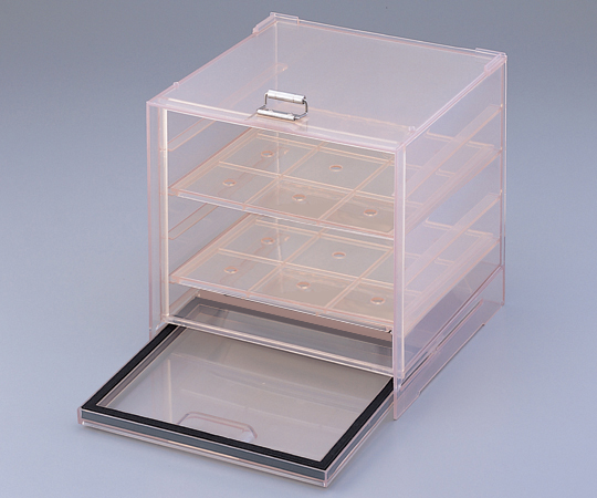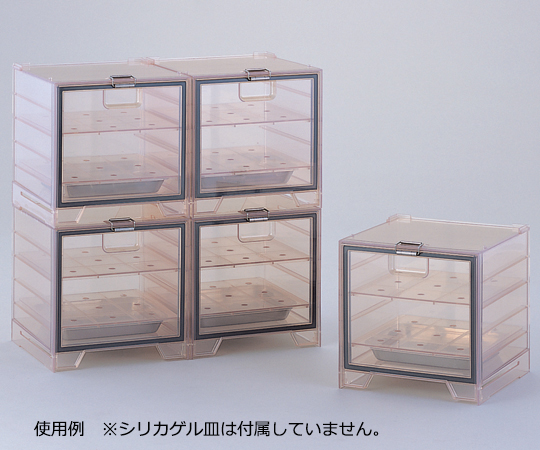 ●上に積み重ねることができます。●非帯電樹脂仕様で静電気の影響を抑えます。●材質:本体・フタ・棚/非帯電ABS樹脂(表面固有抵抗値 3×10^11Ω(参考値))、留金/SUS303●棚段数:4段●棚間隔:43mm●棚板耐荷重:約2.5kg/段●総耐荷重:約10kg●重量(棚板含む):約1.8kg●付属品:棚板×2枚(非帯電ABS樹脂)●外寸法:250×250×250mm●内寸法:215×220×200mm●※シリカゲル皿は付属していません。(推奨シリカゲル皿:ステンレス角型バット4-5309-01)