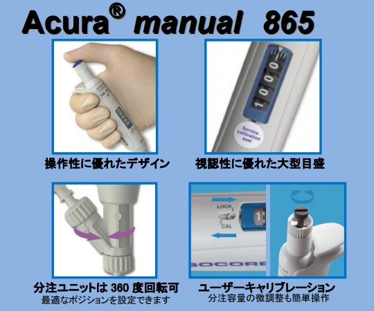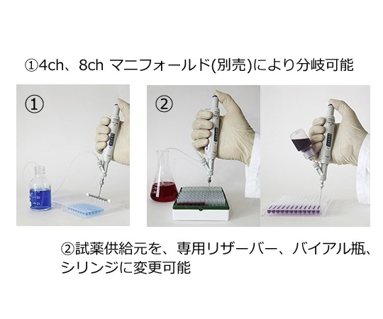 ●アキュラマイクロピペットをベースにした分注器です。●ドラフトやクリーンベンチやグローブボックス内で、ディスペンサーの代わりとしてご使用いただけます。●本体を分解する事なくオートクレーブ処理ができます(121℃・20分)。●ユーザー自身で校正可能です(工具不要)。●分注容量:5~50μL●最小可変容量:0.1μL●精度:<±5.0%(5)●再現性:<2.0%(5)(※( )の容量における精度・再現性です。)●付属品:シリコンチューブ(90cm)×1本、ステンレス製カニューラ×1個、インレットバルブキャップ×1個●※スタンドは別売です。●型番:865.0050
