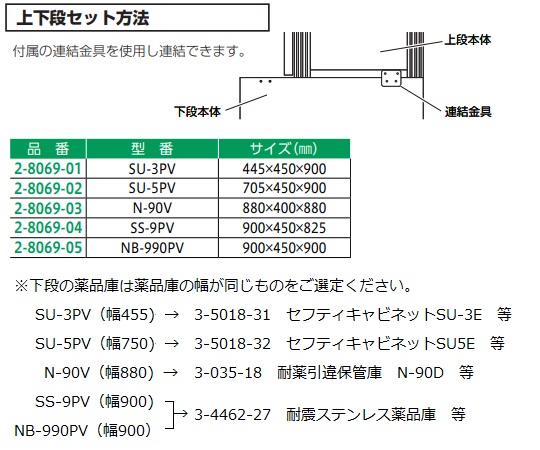 ●酸系に強いPVC製薬品保管庫です。●従来のステンレス・スチール製の薬品庫と互換性のあるサイズですので、上段として相互連結が可能です。●天井には排気ダクト(別売)が接続可能です。●サイズ(mm):900×450×900●材質:PVC(塩化ビニル樹脂)●鍵付き●付属品:棚板×2枚・連結金具×2枚●※扉のヒンジ部や鍵など一部に金属部品を使用しています。●※SU-5PVと同一ナンバーキーです。●※特注及び追加工可能です。
