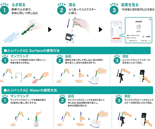 ●簡単操作、10秒で結果を数値表示。●アプリと連動させたデータ管理が可能。●クラウド管理でどこでもアクセス可能。●いつでもどこでも3ステップでかんたん衛生検査。●洗浄不足に起因するトラブルを未然に防ぐための必須アイテム。●食品製造、飲料製造、外食・給食施設、海外監査、工場監査、店舗監査あらゆる現場の衛生管理に適しています。●感染対策室、中央材料室、内視鏡室、透析室、ME室、歯科、栄養科あらゆる現場の衛生管理に適しています。●清浄度管理・衛生教育に適しており、わずか10秒で測定結果がわかります。●スマートフォン・タブレットとの無線通信が可能です。●測定時間:10秒●機能:温度補正機能、自己診断機能、スマートフォン・タブレットとの無線通信●測定単位:RLU●データメモリ:2000データ●Bluetooth搭載●有機ELディスプレイ●本体サイズ:65×176×40mm●本体重量:255g(電池除く)●電源:単3アルカリ乾電池2本、または単3ニッケル水素充電池2本●付属品:単3アルカリ乾電池2本、清掃ブラシ、USBケーブル、ストラップ、クイックマニュアル●※試薬保存方法:2~8℃(凍結しないこと)●※ご使用には、別途消耗品(ルシパックシリーズ)が必要です。下記よりお選びください。●●ルシパックPen 100本入(2-8524-02)●●ルシパックPen-AQUA 100本入(2-8524-04)●●ルシパックA3 Surface 100本入(2-8524-12)●●ルシパックA3 Water 100本入(2-8524-14)●●ルシスワブ Φ2.8×400mm 100本入(61-9632-75)●●ルシスワブ Φ3.2×400mm 100本入(61-9632-76)●※海外向けの販売不可