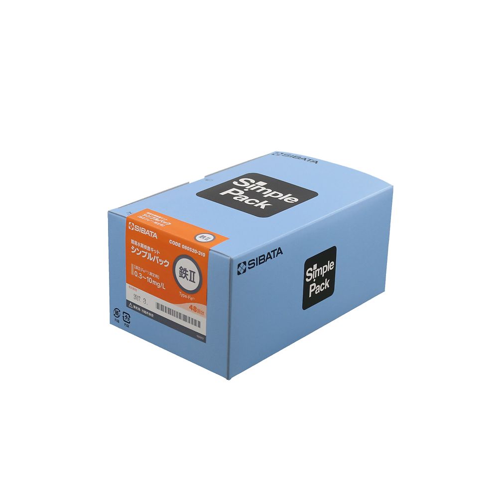 ●工程管理や実際の水を測定する現場では、含有物がどの程度あるか、一定量以上含有されているか、採水して実験室に持って帰る必要があるかなどの判断を要求されることが多々あります。そのような時には簡便で、特に経験もいらず、ただちに結果が得られるものが望まれます。●シンプルパックは簡便で、しかもJIS法、衛生試験法などの公定法に採用されている比色法に基づいて開発されたものです●検水をシンプルパックに吸水して振り混ぜ、付属の標準カラーチャートと比較するだけで結果が得られます。●用途:簡易水道水、井戸水、ビルの貯水槽などの飲料水の管理。用水管理、排水管理、環境調査、養魚管理など。●シンプルパック(R)●型番:080520-310●測定項目(識別記号):鉄Ⅱ(Fe2+)●測定範囲:0.3~10mg/L(6段階)●入数:1箱(48個入・48回分)●カラーチャート表示色:0.3、0.5、1、2、5、10●呈色:淡橙→橙●反応時間:20秒●付属品:標準カラーチャート×4枚