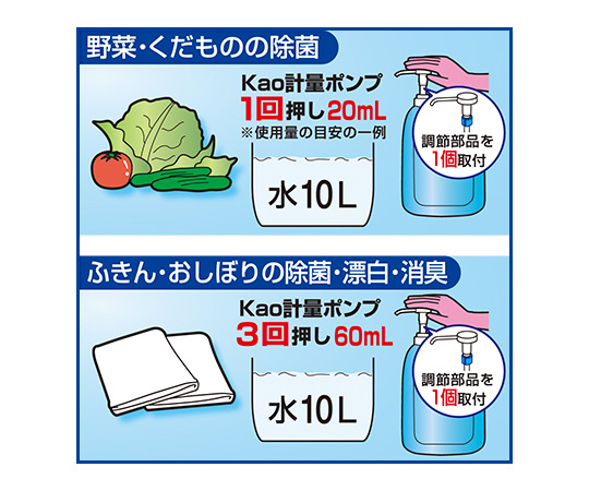 ●除菌・漂白・除臭ができます。●食品添加物ですので、安心して使用できます。●使用上の注意:用途外に使わない。●子供の手の届く所に置かない。●認知症の方などの誤飲や他の事故を防ぐため、本品の置き場所・漂白中の食器の取り扱いに注意する。●原液で使わない。●熱湯で使わない。●作業時は保護メガネ、及び炊事用手袋を着用する。●キャップを開ける時に原液が飛び出るおそれがある。また、容器を移動する時は、キャップをしっかり閉める。緩んでいると、液がはねて目や皮ふにつくおそれがある。●他の洗剤などと併用しない。●酸性タイプの製品や塩素系の排水口ヌメリ取り剤・生ごみ・食酢・アルコールと混ざらないようにする。有害なガスが発生して危険。●水や他のものを入れたり、他の容器につめかえたりしない。破裂することがある。●酸素系漂白剤と併用すると効果が落ちる。●衣類や敷物や家具に液がつくと脱色するので注意する。●直射日光を避け、高温の所に置かない。●倒して保管しない。●使い終わった容器は水で洗い、つぶしてボトルの空気を抜き、キャップを閉める。●〔応急処置〕●目に入った時は、失明のおそれがある。こすらず直ちに流水で15分以上洗い流し、痛みや異常がなくても直後に必ず眼科医の診断を受ける。●万一、有害な塩素ガスを吸い込んだ場合には、直ちに患者を風通しのよい場所に避難させ、安静にした後に速やかに医師の診断を受ける。手当てが遅れると生命にかかわるおそれがある。 ●飲み込んだ時は、直ちに多量の水や牛乳を飲ませる。無理に吐かせないで、速やかに医師の診断を受ける。●皮ふについた時は、直ちに多量の水で充分洗い流す。手当てが遅れると炎症をおこすことがある。異常が残る場合は、皮ふ科医の診断を受ける。●使用中、目にしみたり、せき込んだり、気分が悪くなった時は、使用をやめてその場から離れ、洗眼、うがいなどをする。※受診時は本品またはSDSを持参する。●成分:次亜塩素酸ナトリウム製造時6%(塩素系)、水酸化ナトリウム(アルカリ剤)●用途:野菜・くだものなどの除菌、ふきん・おしぼりの除菌・漂白・消臭、まな板、食器(メラミン食器は使えない)の除菌・漂白・消臭、冷蔵庫、食器棚の除菌・消臭●型番:197486●内容量(kg):5