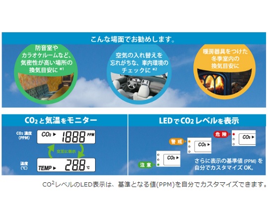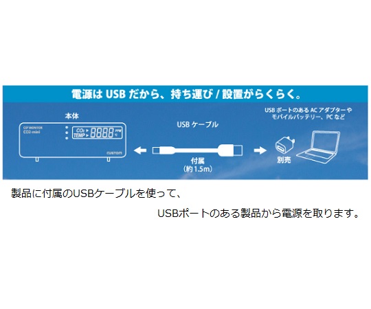 ●数値だけでなく、CO2レベルを3段階表示します(LEDで表示)。●温度センサーを内蔵しており、CO2レベルと気温を交互に表示可能です。●サイズ(mm):169×24×42●重量(g):約70●測定範囲:CO2/0~3000ppm、温度/0~+50℃●分解能:CO2/1ppm(0~1000ppm)、10ppm(1001~3000ppm)、温度/0.1℃●測定精度:CO2/±100ppmまたは±7%rdgの大きい方(0~2000ppm)、±10%rdg(2000ppm~)、温度/±1.5℃●電源:USBから供給(5V、300mA)(USBケーブル付属)●型番:CO2-mini