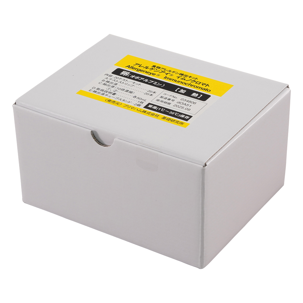 ●誰でも容易に・迅速に・精度良く・低コストでの検査が可能です。●目視で判定できるイムノクロマト法で、特別な測定機器は不要です。●1検体あたりが低コストですので、自主検査に適しています。●加熱や加圧の有無によらず様々な食品の検査が可能です。●アレルゲンアイ(R)イムノクロマトシリーズ●卵(加熱用)●入数:20回分●検出感度:食品中のアレルゲンタンパク質2ppm●テスト時間:20分●※保存方法:1~30℃(室温)●※本キットは食品中の特定原材料を測定する研究用試薬で、アレルギー症状の発症を診断する臨床検査薬ではありません。アレルゲン摂取量とアレルギー症状との相関は不明です。●セット内容:テストストリップ(個包装・乾燥剤入)×20本、検出液(凍結乾燥品)×20本、抽出液(10倍濃縮)50mL×2本