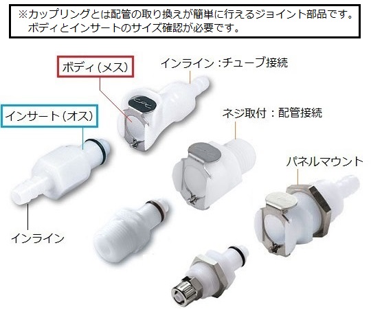 ●親指操作のラッチ構造で、片手で脱着が可能です。●カチッという音で確実な接続が確認できます。●材質:本体・バルブ/ポリアセタール、ラッチ・外部スプリング・ピン/ステンレス、バルブスプリング/SUS316、Oリング/NBR(ニトリルゴム)●使用圧力:真空~0.84MPa●使用温度範囲:-40℃~82℃●タイプ:ボディ●接続:内径3.2mm用●アセタール・弁付き●型番:PMCD1702