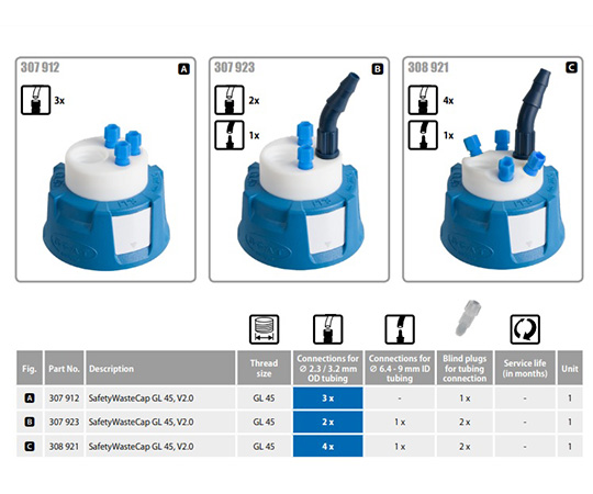 ●廃液容器からの気化ガスを排気フィルター(別売)を通して安全に排出できます。●HPLC用の廃液回収キャップとして最適です。●キャップ側面に識別用ラベルが挿入できます。●キャップ口径:GL45●入数:1個入●材質:キャップ/PPS・PTFE、シーリング/FKM、フィッティング/PFA●ポート数:外径φ2.3mmチューブ用ポート×2箇所、内径Φ6.4~9mmチューブ用ポート×1箇所●※フィッティングの色の指定はできません。●付属品: 外径φ2.3mmチューブ用フィッティング×2本、外径φ3.2mmチューブ用フィッティング×2本、内径φ6.4~9.0mmチューブ用フィッティング×1本、ブラインドプラグ×2本●原産国:ドイツ
