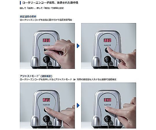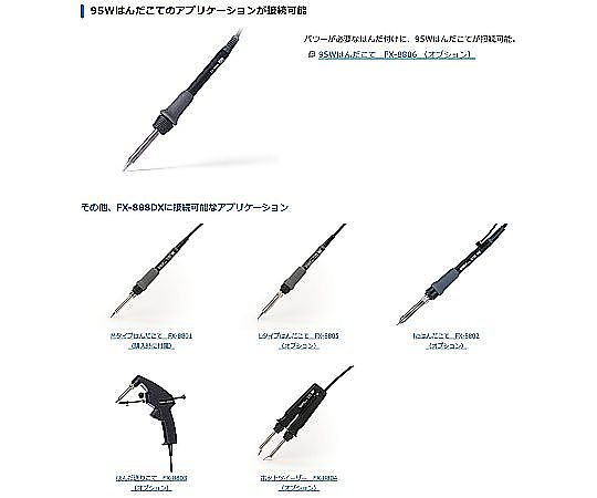●ロータリーエンコーダ採用、追及された操作性●▼ロータリーエンコーダを左右に回すだけで温度変更可能●▼回して「選択」、押して「確定」で簡単に設定●パワーが必要なはんだ付けに、95Wはんだこてが接続可能(オプション)●鉛フリーオススメ:鉛フリーはんだを使用した作業にもオススメの製品です。●RoHS対応(2024年7月時点):欧州RoHS指令禁止10物質の規制値に対応した製品です。●本体色:チタニウムシルバー●電源:AC 100V 50/60Hz●消費電力:100W●プラグ形状:2極接地型プラグ●設定温度範囲:50~480℃●リップル温度:±1℃(無負荷時)(200~480℃の間で設定時)●ステーション部●▼出力:AC 26V●▼外形寸法:100(W)×120(H)×125(D)mm●▼重量:1.2kg●こて部●▼消費電力:65W(26V)●▼こて先アース間抵抗:<2Ω●▼リーク電圧:<2mV●▼ヒーター:セラミックヒーター●▼付属こて先:B型(T18-B)●▼コード長さ:1.2m●▼全長:217mm(こて先T18-Bを付けた場合)●▼重量:46g(こて先T18-Bを付けた場合)●※全長と重量はコードを除きます。●セット内容●▼本体(電源コード付き)チタニウムシルバー●▼こて部 FX-8801 こて先B型(T18-B)付き(FX8801-01)●▼こて台(クリーニングスポンジ・クリーニングワイヤー付き)チタニウムシルバー(FH800-05SV)●▼取扱説明書