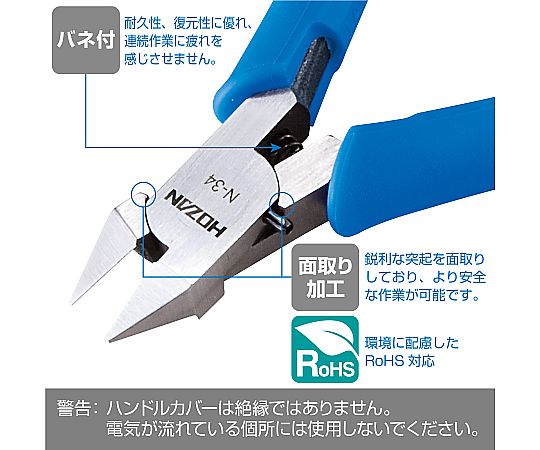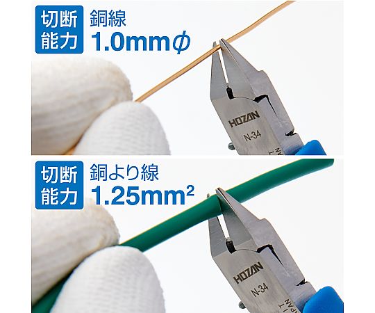 ●細い銅線の切断に(薄刃仕上げ)●N-31の薄刃仕上げです。刃付けの角度が浅い(鋭角)仕上げで切断時のハンドル荷重が軽く、切れ味が優れています。●面取り加工●硬度:HRC57(刃部)●重量:40g●銅線 1.0㎜φ/銅より線 1.25m㎡●全長:102.5㎜●入数:1