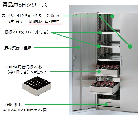 ●錆びにくい耐薬品性に富んだステンレス(SUS304)製です。●2枚扉には別々に鍵が付いています。●500mL瓶収納の場合、250本まで収納できます。●薬品庫としてだけでなく、保管棚としても使用できます。●外寸法(mm):950×510×1800●内寸法:412.5×443.5×1710mm(×2室)、下部引出し/410×410×100mm●材質:本体/ステンレス(SUS304)、レール/スチール、棚板・引出し/ステンレス(SUS304)●ドア材質:ステンレス(SUS304)●棚受・溝ピッチ:50mm●本体重量:約120kg●最大収納数:500mL×250本●棚耐荷重:最大20kg/段●仕切板サイズ:410×440×120mm●付属品:棚板×10枚(レール付き)、引出し×2個、500mL用仕切板×8枚(枠1個付き)×4セット●※運送費・搬入費・据付費・組立費等が別途必要です。お問い合わせください。●※床固定金具・アンカーボルトは付属しておりません。床面材質に合ったものをお選びください。ご使用の場合は別途ご準備ください。推奨φ10mm。●★※木製の梱包(木枠・パレット等)を使用しています。