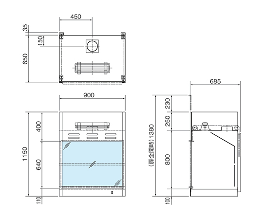 ●コンパクトな卓上タイプのドラフトチャンバーです。●PVC(塩化ビニル樹脂)製ですので、酸・アルカリを使用する作業に適しています。●ファンなし●外寸法(mm):900×685/650×1150●本体材質:硬質PVC(塩化ビニル樹脂)●サッシ:4mm厚透明PVC(塩化ビニル樹脂) バランスウェイト式 開口制限鍵付き(高さ300mm)●照明:LED蛍光灯(15W×1灯相当)●電源:AC100V 50/60Hz●電源コード:2.5m 接地型2Pプラグ PVC(塩化ビニル樹脂)ボリュームダンパー 相フランジ付き●排気口:200A●※特注及び追加工可能です。