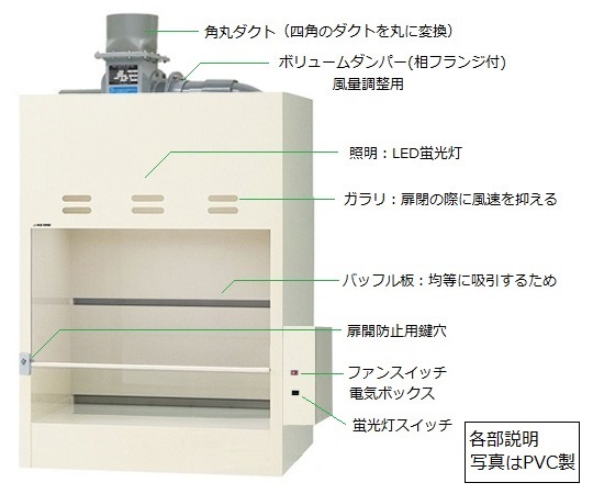 ●コンパクトな卓上タイプのドラフトチャンバーです。●PVC(塩化ビニル樹脂)製ですので、酸・アルカリを使用する作業に適しています。●ファン付き●外寸法(mm):900×685/650×1150●本体材質:硬質PVC(塩化ビニル樹脂)●サッシ:4mm厚透明PVC(塩化ビニル樹脂) バランスウェイト式 開口制限鍵付き(高さ300mm)●照明:LED蛍光灯(15W×1灯相当)●電源:AC100V 50/60Hz●電源コード:2.5m 接地型2Pプラグ PVC(塩化ビニル樹脂)ボリュームダンパー 相フランジ付き●排気口:200A●排気ファン:PVC製シロッコファンNo.150・モーター直結型・単相100V 0.2kW●※排気ダクトの距離や曲り回数によっては、ファン能力が不足する場合があります。●※装置側面にファン操作回路を収納した電気ボックス(幅150mm)が突起します。●※運送費・搬入費・据付費・組立費等が別途必要です。お問い合わせください。●※特注及び追加工可能です。