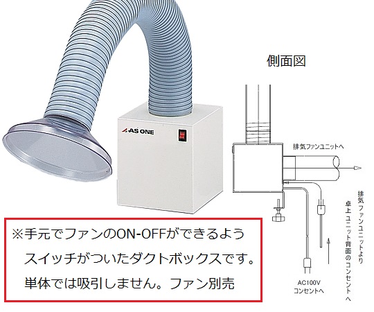 ●局所的にエアを吸引するときに便利です。●吸引口の向きを調節できるフレキシブルタイプのフードです。●材質:PP、丸型フード部:PET●重量:6.6kg●ダクト接続部:φ75mm●本体サイズ(mm):534×185×155●外付けファンユニット用ON/OFFスイッチ・コンセント付き●※局所排気装置の申請が必要な場合のご使用には適しません。●※ご使用には別途ファンユニットが必要です。