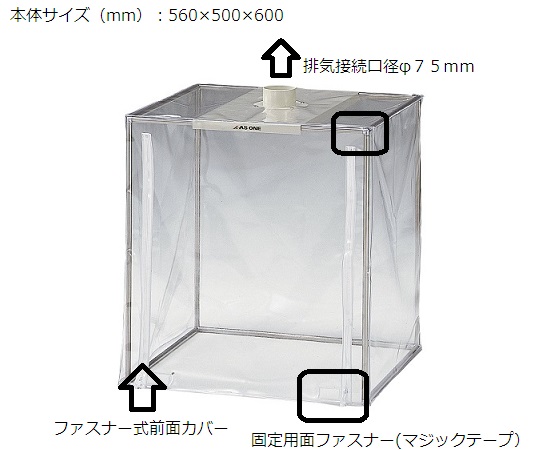 ●手軽に使える簡易フードです。●材質:カバー/軟質透明PVC(塩化ビニル樹脂)、フレーム/ステンレス(SUS304)パイプ●重量:4kg●ダクト接続部:φ75mm●本体サイズ(mm):560×500×600●※局所排気装置の申請が必要な場合のご使用には適しません。