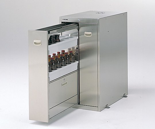 ●標準装備のボトルプロテクターで試薬瓶を一本一本分離固定しますので、地震等による試薬瓶の転倒・破損を防ぎます。●スライド式薬品トレーの下部には鍵付きの引出し式保管ボックスが装備されており、本体の鍵とは別の保管ボックス専用の鍵がなければ試薬を持ち出すことができない二重安全構造になっています。●壁・床への固定や薬品庫同士を連結できる金具が付属しています(アンカーボルトは付属していません)。●型番:SQ-945S4●外寸法(mm):450×700×900●鍵付きボックス内寸法(mm):547×310×187●本体重量:約55kg●材質:本体/ステンレス(SUS430)、トレー・ボトルプロテクター/PP(ポリプロピレン)、レール/スチール●トレー段数:3段×1列、2段(鍵付きボックス)×1列●トレーサイズ:トレー:PP-80/193×563×82mm、PP-125/390×600×125mm、ボトルプロテクタ:B-500/173×545×80mm、500mL用/φ83mm×12穴●試薬品収納数:500mL×60本●付属品:トレー(PP-80)×5個、ボトルプロテクター(B-500)×5個・(B-250)×1個・(B-100)×1個、固定金具・連結金具一式、管理責任者用ネームプレート●※薬品トレー段数を増やす際のトレー・ボトルプロテクター(別売)につきましては、3-4092-01をご参照ください。●※ボトルプロテクターには500mL用の他に100・250・1000mL用もございます。