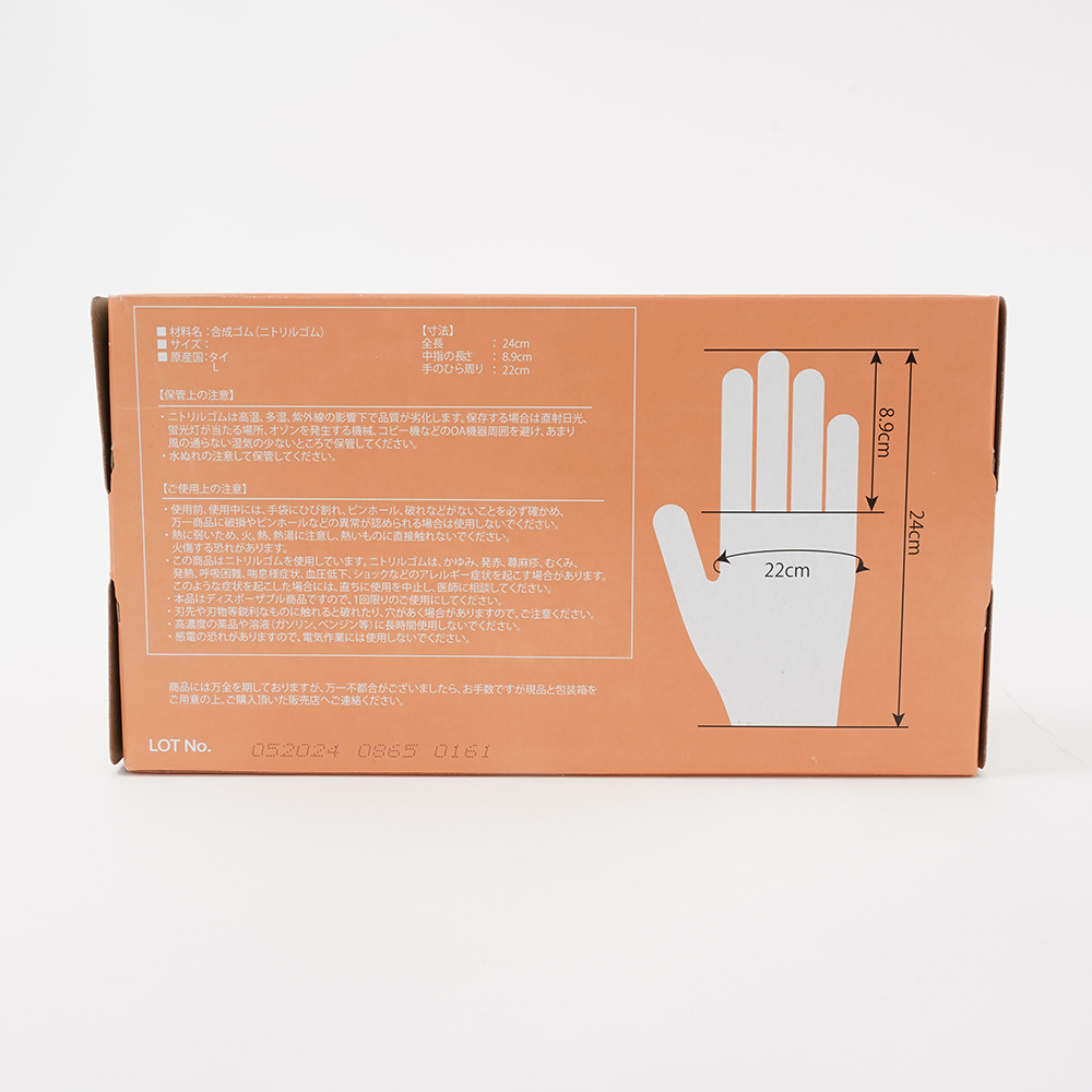 ●サイズ:L●入数:1箱(100枚入)●材質:ニトリルゴム●色:ブルー●各部サイズ:全長/約240mm、手のひら回り/約220mm、中指長/約89mm※参考値●厚み(指先・手のひら):約0.065mm●エンボス加工:指先のみ●パウダーフリー/クロリネーション加工(塩素処理)●食品衛生法適合品