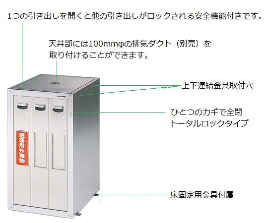 ●錆びにくく耐薬性に優れたステンレス製です。●ひとつの引き出しを開くと他の引き出しがロックされる安全機構付きです。●セフティキャビネットシリーズでサイズを統一していますので、連結金具を使えば連結が簡単に行えます。●天井部には100mmφの排気ダクト(別売)を取り付けることができます。●排気を効率よく行うには別売のベースをご使用下さい。●スタンダード・トータルロック●サイズ(mm):455×600×800●スタンド穴径:500mL用/φ80mm、1000mL用/φ100mm●試薬瓶収納本数:500mLのみ/45本、1Lのみ/24本●引き出し耐荷重:20kg●材質:本体/ステンレス(SUS304)、レール/スチール●本体重量:約35kg●付属品:トレー×9個(PP)、タテ仕切棒×8本、ヨコ仕切板×24個、固定用金具・上下連結用金具×各4個●※上下段で使用できます。●※本体には上下連結金具と床固定金具が付属しています。●※複数台数を横連結・壁面/床固定される場合には(3-5016-11~13)のセフティキャビネット用オプションL4・L2・F4をご購入ください。●※セラミックコートの別注につきましてはお問い合わせください。