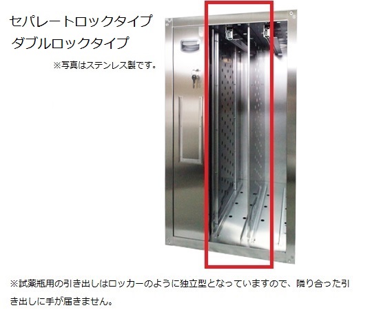 ●セフティキャビネットシリーズでサイズを統一していますので、連結金具を使えば連結が容易に行えます。●引出し毎の施錠に加えて、薬品庫全体の施錠が可能な2重鍵タイプです。●錆びにくく耐薬性に優れたステンレス製です。●試薬瓶用の引出しはロッカーのように独立型となっていますので、隣り合った引出しに手が届きません。●材質:本体/ステンレス(SUS304)、 レール/スチール●ダブルロック●内部塗装:なし●サイズ(mm):756×600×800●試薬瓶収納本数:500mLのみ/75本、1Lのみ/40本●引出耐荷重:20kg●本体重量:約55kg●付属品:トレー×15個(PP)、タテ仕切棒×13本、ヨコ仕切板×40個、床固定金具・上下連結金具×各4個●※トータルロックタイプのセフティキャビネットとの上下連結はできません(左右連結は可能です)。●※セラミックコートの別注につきましてはお問い合わせください。