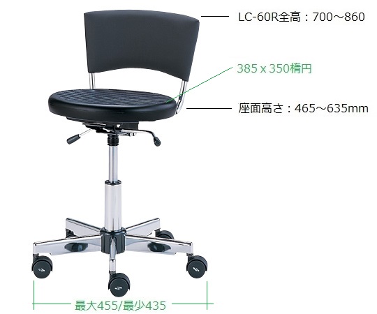 ●微妙な高さの調節もワンタッチで容易に行うことができます。●作業に合わせた姿勢が取れますので、長時間に渡る作業による疲れを軽減します。●背もたれ・座面・キャスターは導電仕様で、静電気を嫌う作業にも適しています。●発塵性を抑える設計・加工が施され、クリーンルーム内でも安心して使用できます。●細部まで“研究者専用”にこだわりました。●型番:LC-60●材質:座部シートパット/ウレタン発泡成型(導電仕様)、背部張り地/ビニールレザー張(導電仕様)●キャスター:φ50mmナイロン製(双輪・導電仕様)●座面高さ調節:90ストローク(ガススプリング)●座面角度調節:前傾5°・後傾7°●幅×奥行×高さ (mm):455×455×645(645~735)●座面サイズ:385×360mm●座面の高さ:415~505mm●重量:10.1kg