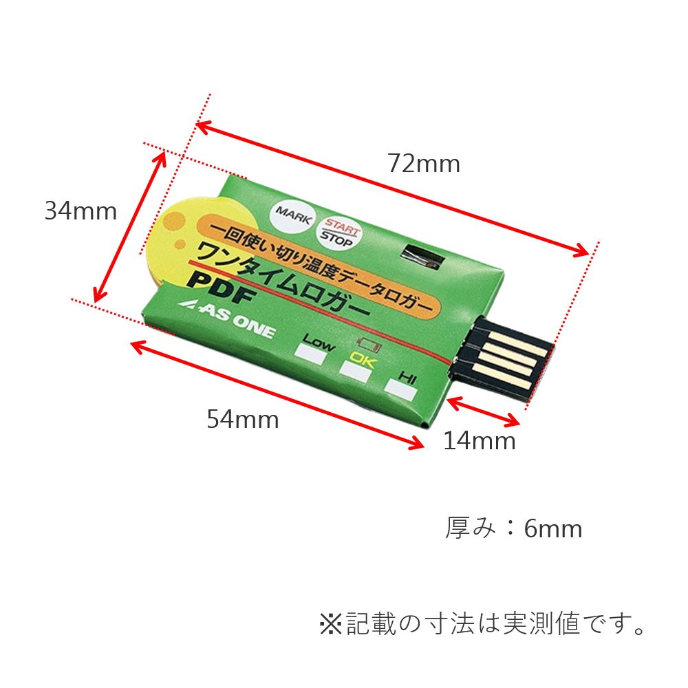 ●まとめ買いがお得です。●1回使い切りで自動でPDF形式のレポートを作成するため、データの改ざんを防止できます。●設定温度範囲を超えた場合、LEDライトでお知らせします。●自動でPDF形式のレポートを作成するため、特別なソフトウェアは必要ありません。●スタートディレイ設定により、スタートボタンを押してから測定開始までの時間を設定可能です。●パソコンのUSBポートに接続し、初期設定や測定結果のダウンロードが可能です。●入数:10個●測定範囲(℃):-30~+70●分解能:0.1℃●精度:±0.5℃●記録可能データ数:8192●使用可能環境:-30~70℃、80%RH以下●内蔵電池:3V CR2032(交換不可)●温度測定間隔:0.5、5、10、30、60、90、120分●スタートディレイ設定時間:0、5、30、45、60、90、120分●アラームディレイ設定:0、5、30、45、60、90、120分●防塵・防水保護等級:IP65(袋に入れた状態)●対応OS:Windows(R) 7、8、10、11●付属品:収納用チャック付きポリ袋●★商品は 3-5373-01(ワンタイムロガー-30~+70)×10個のお届けとなります。●※スタートディレイとは記録スタートボタンを押した後、記録開始を〇〇分遅らせて開始する機能です。●※アラームディレイとはアラーム温度に達してから〇〇分間の平均温度がアラーム温度を超えた場合にアラームが光ります。(一瞬温度を超えてもアラームと感知しないということです)●JANコード:4582110944819