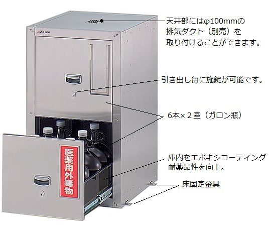 ●セフティキャビネットシリーズでサイズを統一していますので、連結金具を使えば連結が容易に行えます。●引出し毎の施錠に加えて、薬品庫全体の施錠が可能な2重鍵タイプです。●耐薬性に優れたステンレス製です。●庫内をエポキシコーティングし、耐薬品性を向上させています。●天井部にはφ100mmの排気ダクト(別売)を取り付けることができます。排気を効率よく行うには別売のベースをご使用ください。●材質:本体/ステンレス(SUS304)、 レール/スチール●ダブルロック●内部塗装:庫内エポキシコーティング●サイズ(mm):486×600×800●試薬瓶収納本数:12本(ガロン瓶)●引出耐荷重:30kg●本体重量:約30kg●付属品:仕切板×6枚、床固定金具・上下連結金具×各4個●※トータルロックタイプのセフティキャビネットとの上下連結はできません(左右連結は可能です)。●※セラミックコートの別注につきましてはお問い合わせください。
