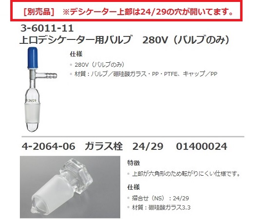 ●別売りのバルブを取付け、ポンプで吸引することで、デシケーター内に入れた湿気を嫌うサンプルを乾燥した状態で保管することができます。●蓋の穴は「NS24/29」の摺り合いになっています。●真空デシケーターとして使用できるよう、蓋の取っ手部分は別売りのバルブ取付用の穴が開いています。●適合中板直径(mm):φ285●外径×高さ(mm):380×424●材質:本体/硼珪酸ガラス●ISO 13130準拠●容量:約17L●重量:本体/約9.5kg、蓋/約4kg●※上口デシケーターには、バルブ(280V)は付属しません。別売です。●★上部摺合:NS24/29