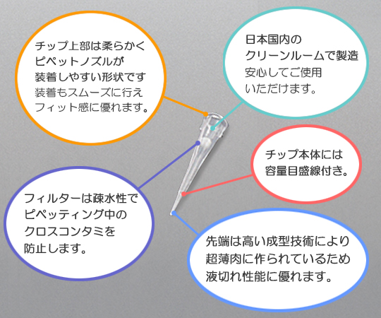 ●ラックは積み重ねが可能ですので保管に場所をとりません。●フィルターは疎水性でピペッティング中のクロスコンタミを防止します。●先端は高い成型技術により超薄肉に作られているため、優れた液切れ性能があります。●チップ上部は柔らかく、ピペットノズルが装着しやすい形状ですので装着もスムーズに行え、フィット感にも優れています。●日本国内のクリーンルームで製造していますので安心してご使用いただけます。●容量(μL):10●色:ナチュラル●入数:1ケース(96本/ラック×10ラック入)●材質:チップ・ラック・プレート/PP(ポリプロピレン)、フィルター/PE(ポリエチレン)●電子線滅菌済●目盛付き●DNA・RNase・DNase・パイロジェンフリー●オートクレーブ不可