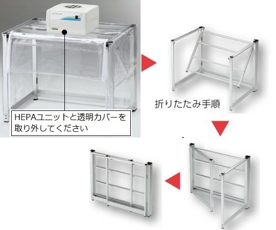 ●不織布製プレフィルターと抗菌・防臭HEPAフィルターを通して、クリーンな空気をワークスペース内に供給します。●工具無しでフレームを折りたたむことができますので、使用しないときは容易に収納できます。●シートカバーの前面に窓が付いていますので、作業スペースが見やすくなっています。●シートカバーの前面はめくり上げて面ファスナーで固定できますので、楽に作業が行えます。●組立時間3分(折りたたみタイプ)組立が容易で短時間で組み立てることができます。必要な時だけセットできるお手軽クリーンブース!●カンタン組立式!●型番:CB1000●陽圧●仕様:ファンユニット2台付き●サイズ(mm)※:1000×500×550(700)●材質:フレーム/アルミニウム、シートカバー/軟質PVC(塩化ビニル樹脂)、窓/硬質PVC(塩化ビニル樹脂)●吹出風量:約1m3/min●吹出風速:約0.5m/s●集塵効率:99.97%以上(0.3μm粒子)●HEPAフィルターサイズ:200×200×50mm●電源:AC100V 50/60Hz 36/38W(ファンユニット1台あたり)●電源コード長:1.8m(2Pプラグ)●折りたたみ時サイズ:1000×75×550mm(フレームのみ)●※( )はユニットを含んだ高さです。