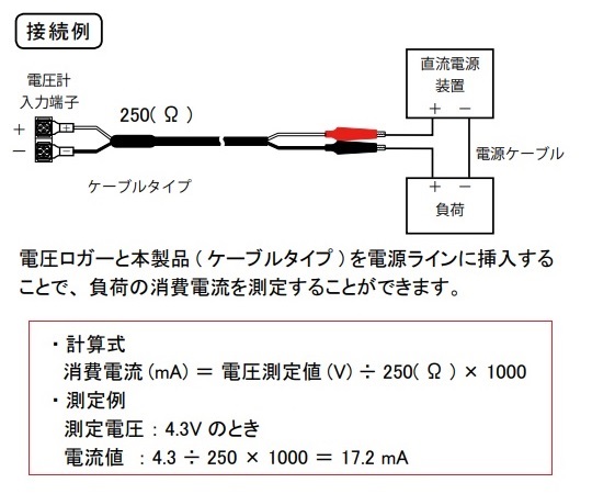 ●固定抵抗器として使用することで直流電流値の計測が可能です。●先端にワニ口クリップを設けていますので、測定箇所にそのまま装着が可能です。●仕様:シャント抵抗ケーブル(ケーブルタイプ)●抵抗値:250Ω ±0.1%●端子形状:M3Y端子⇔ワニ口●サイズ:約1000mm
